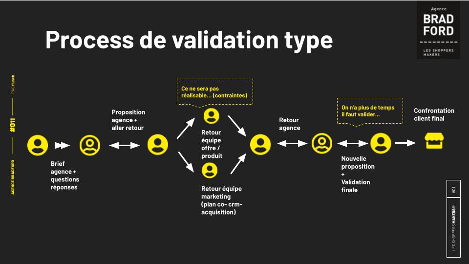 Un process de validation lourd qui engage de nombreux allers-retours, un chef de projet opérationnel souvent seul face à de nombreuses questions ou propositions, des phases de validation qui remontent vers différents services (Produit, digital ou autres…).
